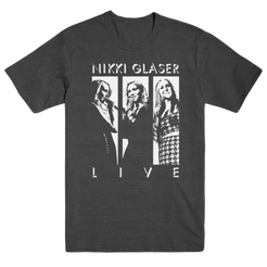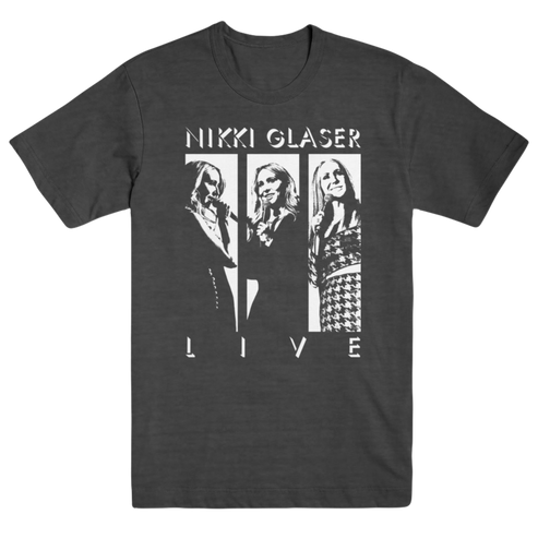 Nikki Glaser Live Photo Tee in charcoal with front print only.